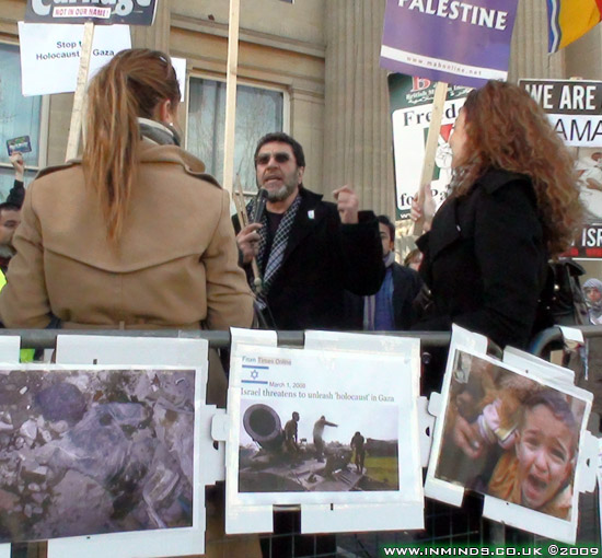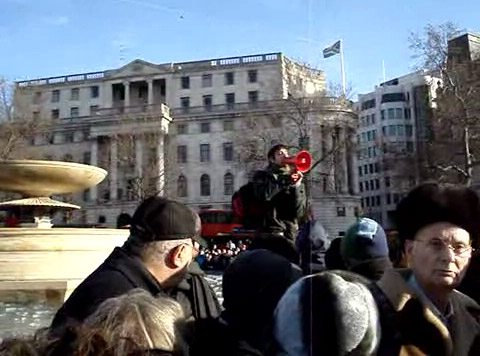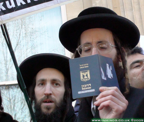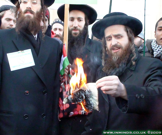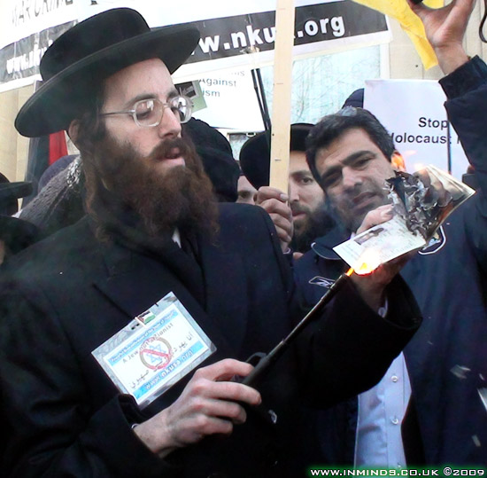 Born in Israel but ashamed of his zionist passport, Rabbi Avraham Greenberg burns his Israeli passport in protest at the slaughter of Palestinians in Gaza at a counter-demo organised by the Islamic Human Rights Commission opposing a zionist rally in Trafalgar Square on 11th January 2009.