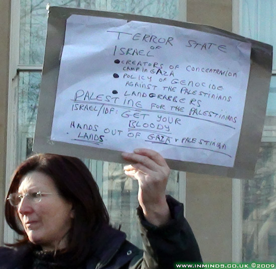 Sometimes home made placards convey the message best: "Israel get your bloody hands out of Gaza"