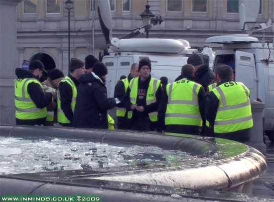 CST - dubbed the "private zionist militia" preparing behind a frozen fountain at Trafalgar Square