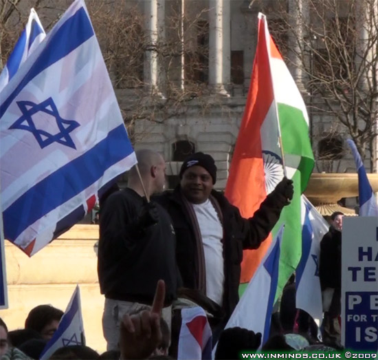 The strangest site in the zionist demo was a lone Indian man holding the Indian flag in one hand and an Israeli flag in the other, surrounded by Israeli flags. The fool reminded us of the Sikh man who appeared in the BNP commercials spouting islamophobic diatribes.