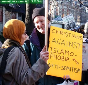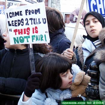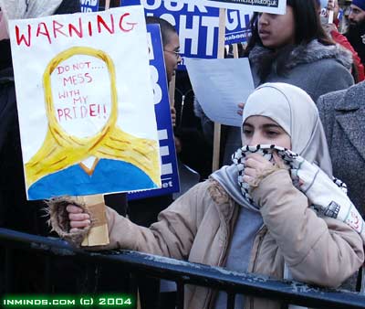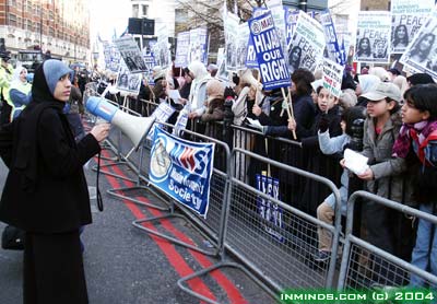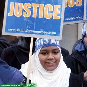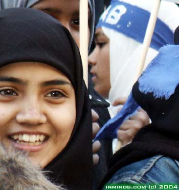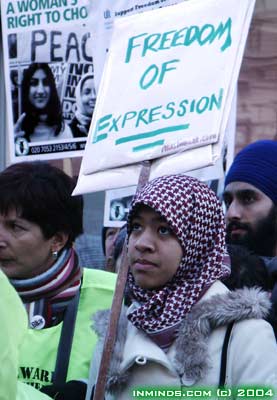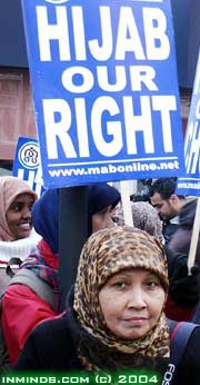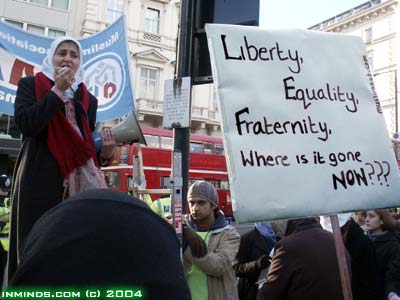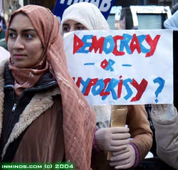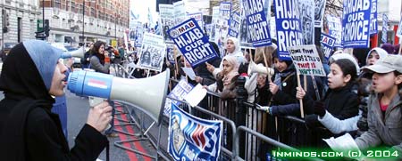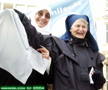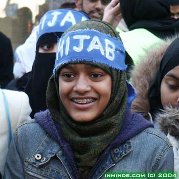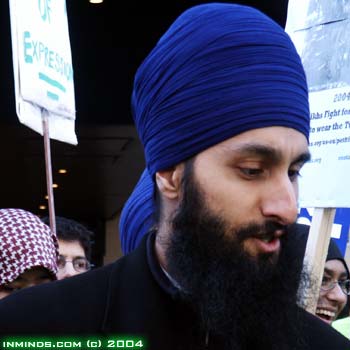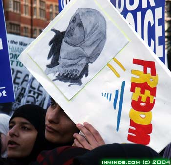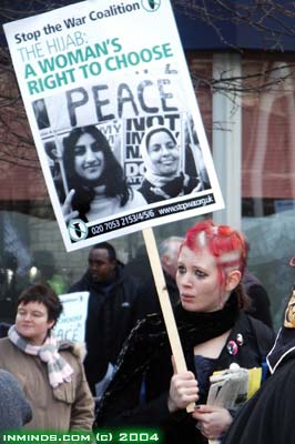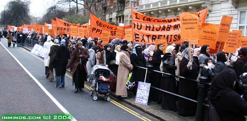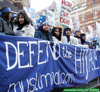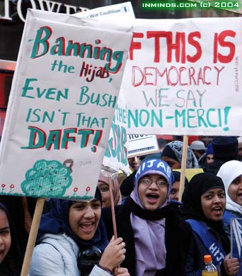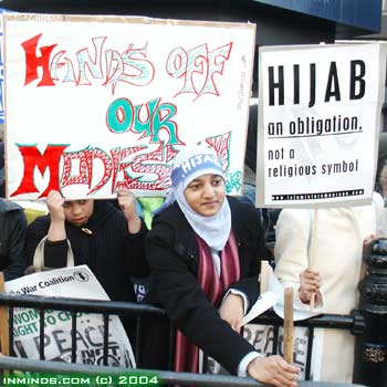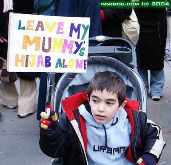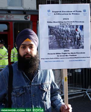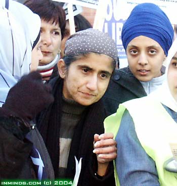 The Sikh community were well represented at the demonstration. Theirs is a very tragic case. The french government in its persecution of Muslims has cast a wide net to create the facade of "equal discrimination" and unwittingly the small Sikh community in France have been caught in this net. Realising this, the Sikh community are hoping for a french reprieve and are vary of being too closely associated with the Muslim protests. In France they pulled out of the demonstration at the last minute, and here in the UK whilst they were brave enough to attend, and in good numbers, their spokeswoman - Mejindarpal Kaur - however insisted it was not a protest: "we are not protestors because we believe we have a right, and the right will be given. We only protest when we think someone has done something deliberately. I think the french government is mistaken about this law and that good sense will prevail."