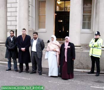 The London demonstration consisted of two parts, one marching from Marble Arch through central London to the embassy, whilst the other staying at the embassy, laying seige to it, with over 20 speakers addressing the crowds. The day was a great success with thousands attending, some having travelled several hundred miles to attend. Many different Muslim groups with differing agendas and outlooks came together, all united in solidarity with their sisters and brothers in France.