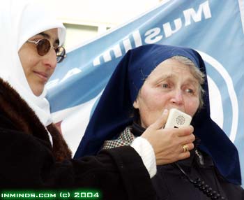 "I come in my hijab, but I'm not a Muslim, I'm a Catholic nun. And I believe this is all part of a move to eliminate God from society be they Christian or Muslim. And it is only God that can make the new order that's worth living in. The new world order of the secular state without God is going to be a horrible place, a tyranny, there would be no freedom, no freedom to worship God who gave us everything. And this is why I have come to support the wearing of the hijab by the Muslim people."